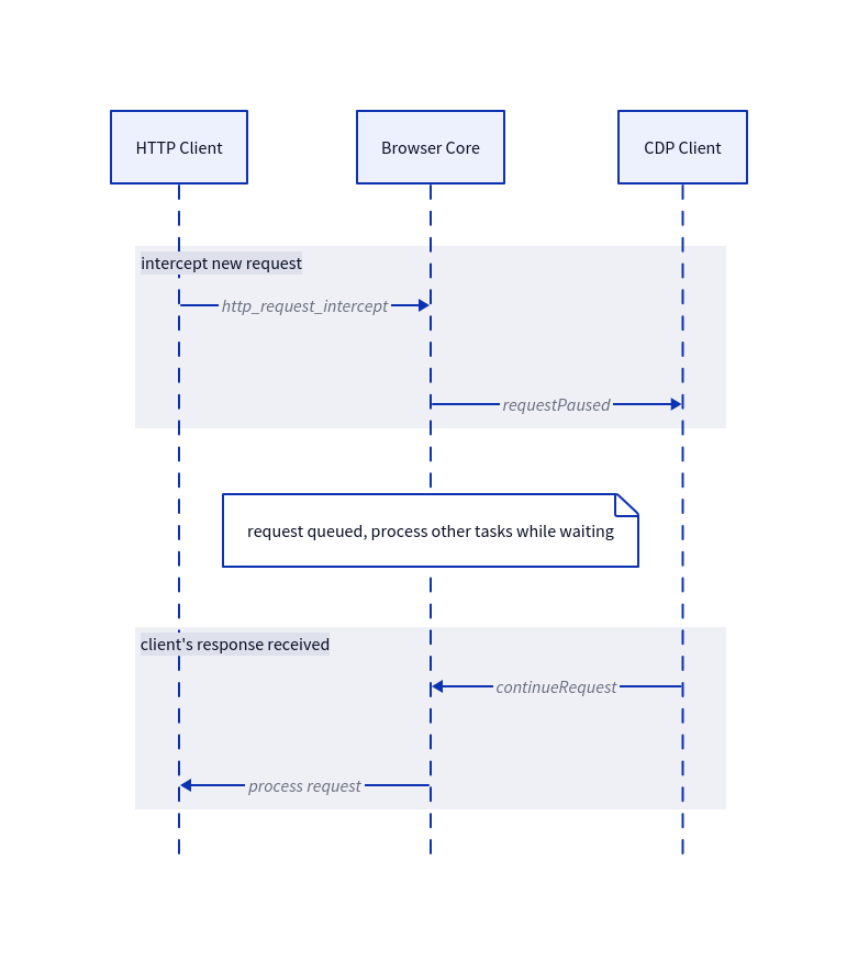 Chrome DevTools Protocol (CDP) is how clients control headless browsers. It’s the standard that Puppeteer, Playwright, and most automation tools speak. For request interception, the flow looks like this: